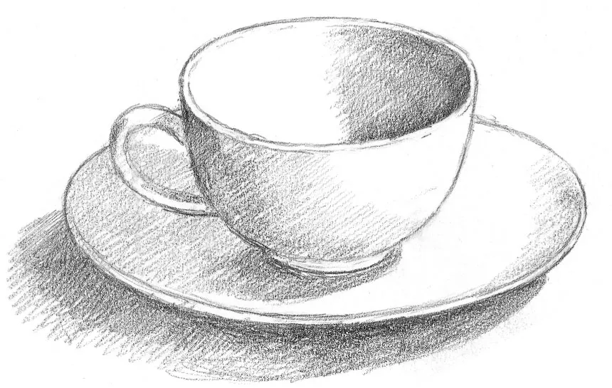 The next example is a cup and saucer, with the handle projecting to one side, and here you also have two objects that fit together to contend with. The shapes are gradually getting more complex to suit your developing skills.
