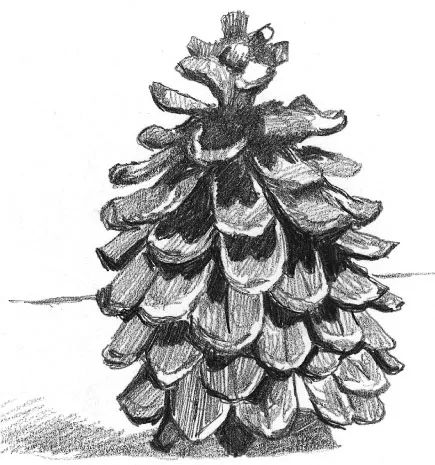 Unlike man-made goods, objects found in nature often have imperfections and unevenness in form. The trick with this pine cone is to make the tones very dark in the central shadows and lighter where the leaves don’t overlap. Because of the variety in shape you don’t have to worry if your drawing isn’t exact.