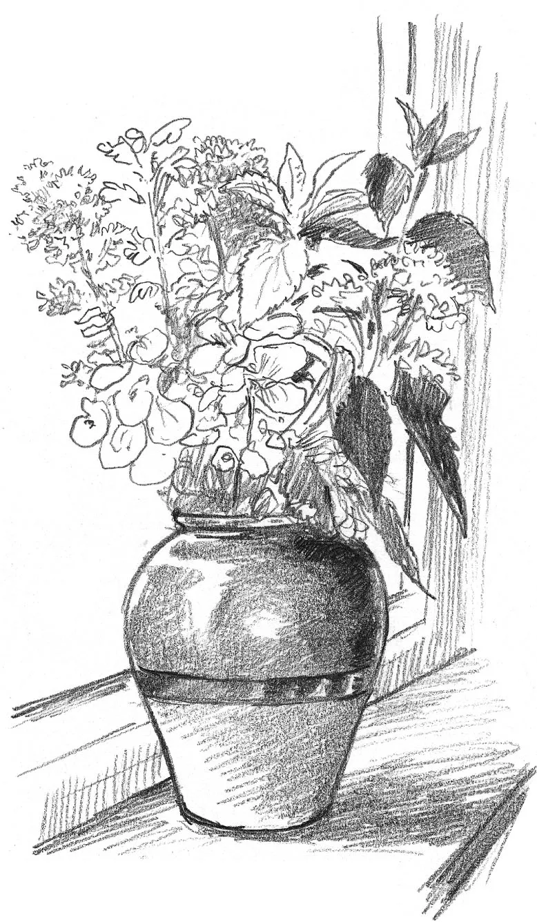 In the case of a vase of flowers, you’ll be drawing both natural and man-made things. Try to make the flowers and leaves look softer and more fragile than the vase.