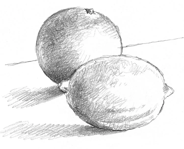 Start with an orange and lemon, placing them in such a way that one overlaps the other. This means that you have to consider the size of one compared with the other, as well as the different shapes. When you put in the tone, notice how the shading on the lower part of the orange helps to show up the shape of the lemon.