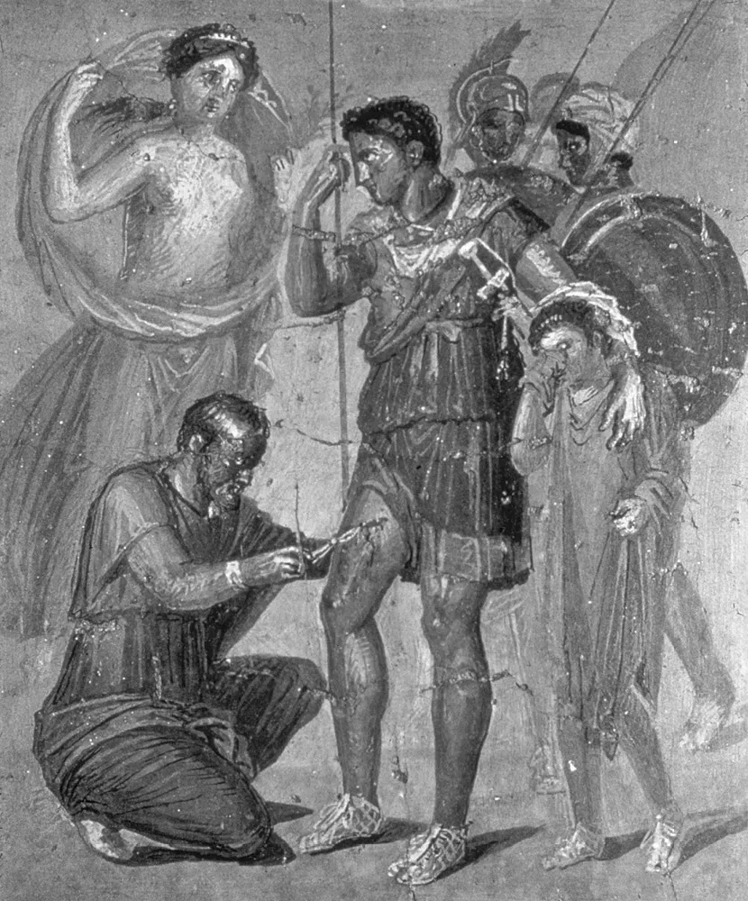 A Roman fresco of a medicus treating the battlefield wounds sustained by Aeneas, the legendary Trojan hero.