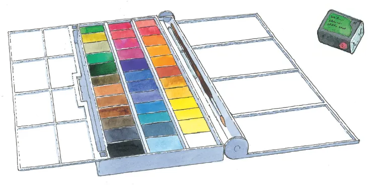 When you have exhausted a colour in your paintbox you can buy a replacement tablet, known as a pan, or half pan, depending on the size. All you need to do is unwrap it and slot it into place. Pans vary in price, since some pigments are more expensive than others because of the rarity of the material from which they are made.
