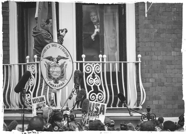 Julian Assange appears at a window of the Ecuadorean Embassy in London. He would not leave the building for fear of being arrested, yet continued to influence events around the world.