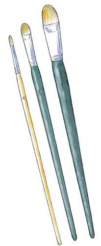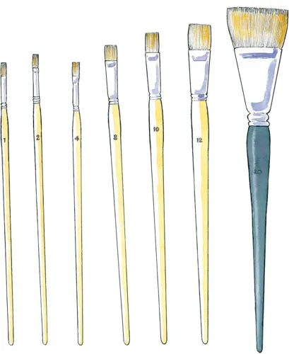 Flat brushes have a flattened set of bristles, rather like a refined version of a decorator’s brush. They are the brushes you’ll use most of the time, as they hold the paint well and you can apply it to your support with both the wide surface and the edge to get varying brush marks. The following sizes are a useful range: 20 (probably the largest you will need unless you wish to paint murals), 12, 10, 8, 4, 2 and 1.