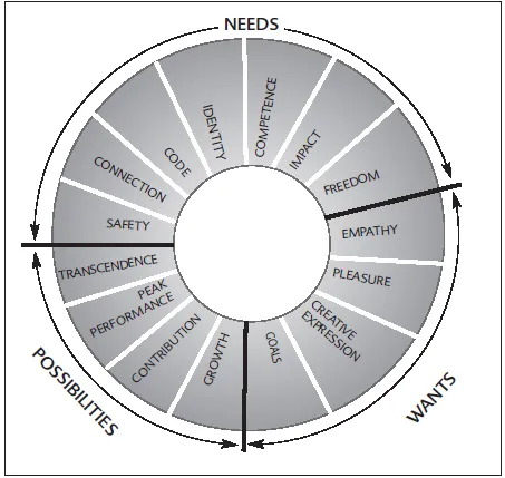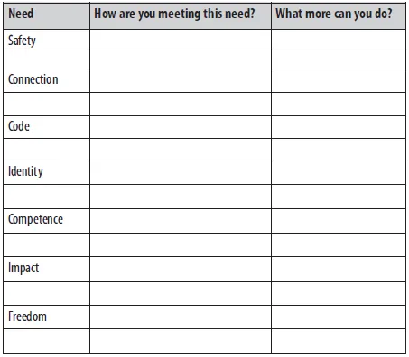 There are seven Human Fulfilment Needs: safety, connection, code, identity, competence, impact and freedom.