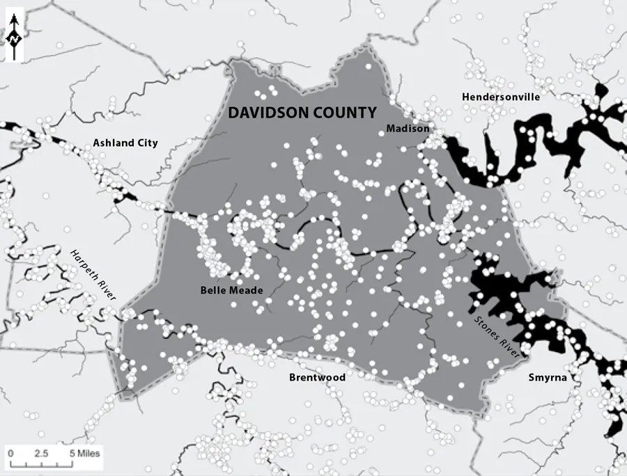 In accordance with federal and state laws, the Tennessee Division of Archaeology maintains a database of known archaeological and paleontological sites within the borders of the state. As of spring 2021, there are nearly 700 site locations officially recorded in Davidson County (Figure 1.2). More than 480 of these include artifacts or fossils originating before AD 1500 and are considered prehistoric. This term is not a value judgement as to the complexity of ancient Tennesseans, but instead means simply that these sites predate the arrival of written texts in the American Southeast.