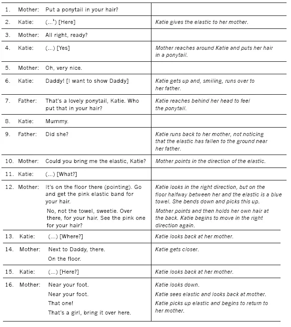 In the following interaction, my daughter Katie, who at this stage had only a two-word vocabulary ('Mummy' and 'Daddy') and yet had moved out of the peekaboo stage, brings a pink elastic band to her mother, who is sitting on the floor in the lounge room, to have her hair put in a ponytail. She sits on her mother's lap, facing her, with the pink elastic in her hand.