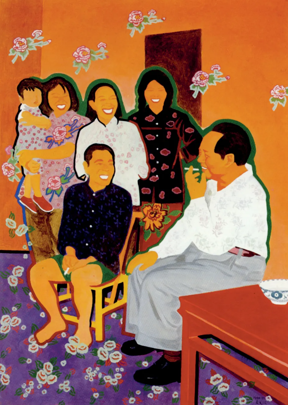 As an artist of a slightly older generation, Yu Youhan experienced the years of the Cultural Revolution while studying in Beijing at the Central Academy of Arts and Crafts. During that time, Yu painted huge images of Mao on a wall of more than 120 square metres (over 1,290 sq. ft) opposite the Tiananmen Tower. To him, the Chairman meant everything â âa great leader of the nation, a symbol of China or the East, a book of culture or a particular period of history. Sometimes Mao is avant-garde, but sometimes rather conservative.â6 From the end of the 1980s, however, the artist began to re-portray Mao in a completely different way. Most of his early paintings are based on journalistsâ photographs of Mao published in the pictorials officially sanctioned by the state. All the images that were accessible to the public were positive, as well as historically and politically significant, celebrating Mao leading the country and his people on the way to the success of the Peopleâs Republic. In Yuâs series Mao and His People, the leader is positioned in the centre of each work, his pose appropriated from the well-known photograph of Mao at the talks in Yanâan (see p. 7).[8] Instead of the original patched trousers, however, his suit is patterned with flowers, and these are also dotted around the painting, which is turned into a fabric-like composition. Similarly, floating flowers are applied to the 1991 work Talking with Hunan Peasants, based on a 1950s photograph depicting Mao sitting graciously with a family of cheerfully admiring peasants â the men notably sitting, while the women stand â in his home town, Shaoshan, in Hunan Province.[9] The floral patterns were the artistâs own invention, inspired by the paper flowers used as so-called âspiritual rewardsâ in communist China. Imposed on Mao and the other figures, they appear everywhere in the painting, recalling the native style of folk art. As the artist has reflected, âThe floating flowers decorate the space quite nicely, and yet make it an unreal and hollow environment. Communism, which we are encouraged to dedicate our lives to, seems to be a beautiful paradise, an unreachable destination. However, people do not have the ability to expose the lie, or break away from the dream.â7 The subjectsâ smile, the collective smile, joyfully in unison under the guidance of Mao, represents the over-idealized relationship between the Chairman and his people, while their ignorance of the situation is somehow divulged by their bare white teeth.