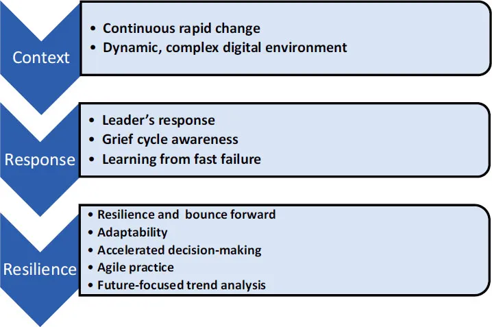 Consolidating the above elements helps create new responses required of digital leaders in a fast-paced digital era. This has resulted in Figure 1.1 which highlights the context, the response and resilience aspects in organisations that leaders need to consider in the future.