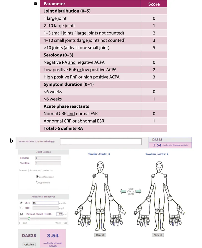 (a) EULAR/ACR 2010 classification criteria for rheumatoid arthritis; (b) DAS28 scoring system – a freely available online tool that can be used in the clinic to calculate the Disease Activity Score (DAS) based on 28 joints assessed clinically for swelling and tenderness (see www.4s-dawn.com/DAS28). Scores are entered in the tool, together with inflammatory markers ESR or CRP, with the patient global assessment of their disease on a 0–100mm scale. A numerical DAS28 score is then calculated and recorded.