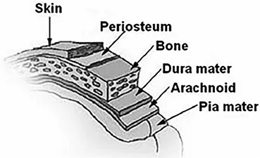There are three layers of meninges around the brain and spinal cord. The outer layer, the dura mater, is tough, white fibrous connective tissue. The middle layer of meninges is the arachnoid, a thin layer resembling a cobweb with numerous thread-like strands attaching it to the innermost layer. The space under the arachnoid, the subarachnoid space, is filled with cerebrospinal fluid and contains blood vessels. The pia mater is the innermost layer of meninges. This thin, delicate membrane is tightly bound to the surface of the brain and spinal cord and cannot be dissected away without damaging the surface.