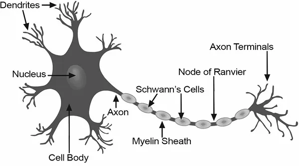 Each neuron has three basic parts: cell body (soma), one or more dendrites, and a single axon.
