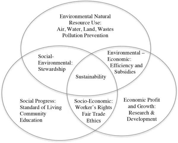 Monitoring and assessing our progress along these paths of change requires a way to measure progress, or some form of an indicator. This monitoring is frequently organized in the form of âThe Triple Bottom Lineâ (Figure 1.1). Unless all aspects of life are taken into account, nothing can be truly sustainable. As Ray Anderson, former CEO of Interface Inc. says: âYou can't make a green product in a brown company, and you can't have a green company without a green supply chainâ (2006). Similarly, you cannot have a green (sustainable) city if the state is brown (unsustainable), or a green country if the rest of the world is brown. By this I mean no one, no region, no time period can be degraded at the expense of creating one âperfectâ location. For example, if we send our trash to the other side of the world, it will be burned there, but the toxins will enter the air stream and return to us in the form of chemical-laden rain. There is no âaway.â