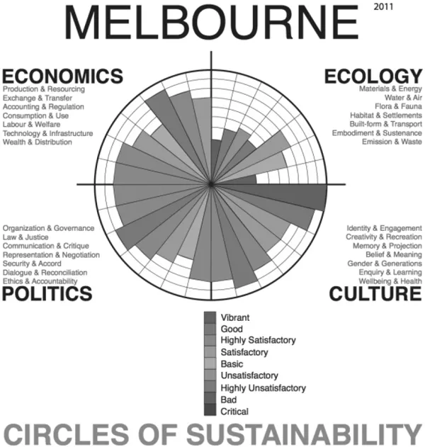 The Triple Bottom Line (Figure 1.1) represents what needs to be measured in sustainability, but not how to measure it. The Cities Programme of the UN Global Compact has modified the traditional diagram to include a measurement indicator (Figure 1.2), the Circles of Sustainability. An indicator informs you when a condition is operating as planned; it can also indicate the direction needed to bring an issue back into balance. Indicators are varied, but they always have some characteristics in common: they must be relevant, easy to understand, reliable, and based on data that is easily accessible (Hart, 2010).