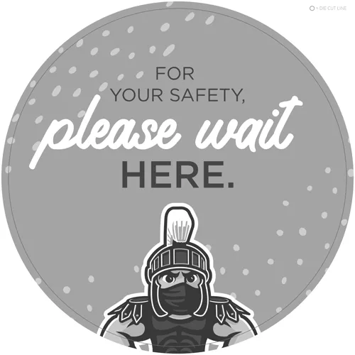 Consider, for instance, the created digitally and rendered physically graphic shown in Figure 1.2, one of the university-produced graphics designed to be printed as an 8-inch by 8-inch sticker to affix to floors to maintain physical distancing. The graphic includes multiple colors: light green, our university branded dark green (PMS: 567; CMYK: C:82 M:0 Y:69 K:59; web: 18453B), and white. The graphic includes some text and two fonts, one of which is our university-branded font face, Gotham, the other a complementary script font face. It also includes one key image: An illustration of our university mascot, Sparty, wearing a mask. The final graphic content is the seemingly hand-drawn set of non-symmetrical dots in the background.