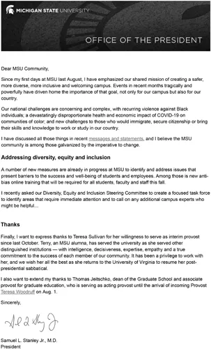 Also consider a recent update by the university president, shared to university stakeholders (faculty, students, staff) via email and also available on the presidentâs website (Figure 1.3). The email includes a header graphic with the university Spartan helmet, along with the âMICHIGAN STATE UNIVERSITYâ text treatment and âOFFICE OF THE PRESIDENT,â both appearing in our university-branded Gotham font face. The letter uses bold face and larger text for headings to separate content in the letter and to visually signal a shift in focus. The letter also includes a graphic representation of the presidentâs handwritten signature.