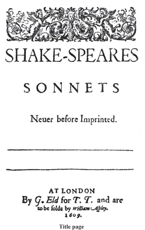 In Q, the first words appear on the title page. <snt_titlepage> It asserts the ‘SONNETS’ are ‘SHAKE-SPEARES’, that they are published in ‘1609’, and are ‘Never before Imprinted’. ‘G. Eld’ does the printing for ‘T.T.’, with the copies sold by one of two London booksellers, John Wright or William Aspley (who are named on one or other title page). External evidence identifies the initials ‘T. T.’ as those of Thomas Thorpe, a well-known publisher of the day.