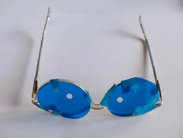 This was a significant discovery: a blue filter attached to a pair of clear glasses or low power lenses cures low-grade myopia. Here is a brief description of the process and a picture of the prototype. A small hole made with paper punch must be aligned with your eyes at reading distance. When you read through that clear spot, it will appear red by simultaneous contrast. This contrast causes your eye to over-focus (become temporarily more myopic). After 30â50 minutes of reading, you will be much less myopic for a short period of time. Repeated sessions will make the myopia go away permanently. When I first did this, I did not understand why the glasses were also making my close vision better. I now believe it was because the over-focusing was causing me to exercise the focus muscles.