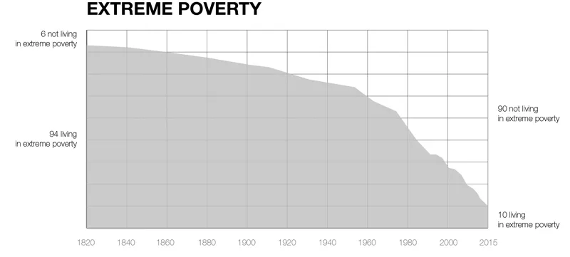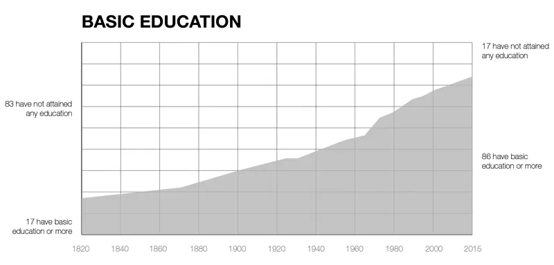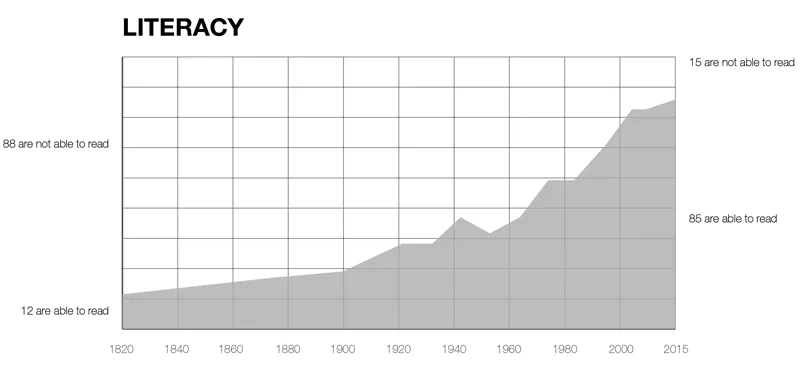 Figure 1.3. The world as 100 people in poverty, education and literacy the past 200 years, adapted from Our World in Data by Max Roser (ourworldindata.org)