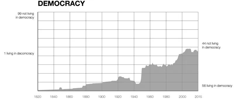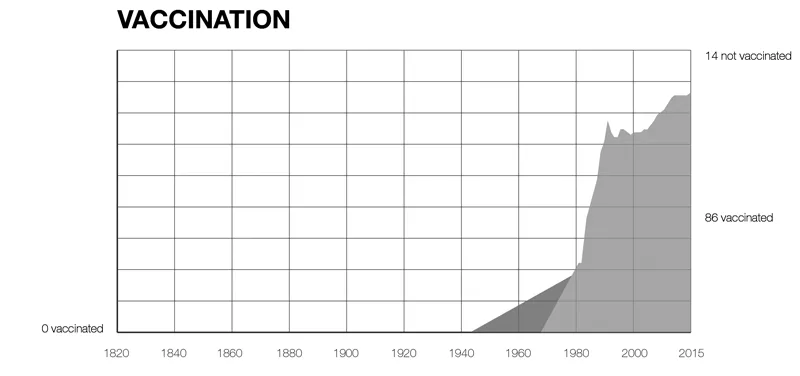 Figure 1.4. The world as 100 people in democracy, vaccination and child mortality the past 200 years, adapted from Our World in Data by Max Roser (ourworldindata.org)