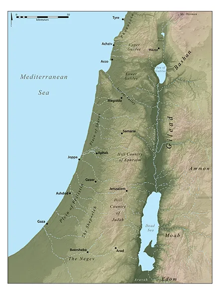 A region is âdetermined by a complex of climatic, physiographic, biological, economic, social, and cultural characteristicsâ (Forman and Godron 1986: 13). Using this definition, the southern Levant can be divided into four main zones with several distinct regions, namely the Coastal Plain, the Central Mountains, the Jordan Rift, and the Transjordan Highlands (Aharoni 1979: 21â42). Within these zones, certain regions are delineated based upon physical and cultural geography, including underlying geology and soils (see Figure 1.1). For reference, they are often designated by the Israelite territorial allotments delineated in Joshua 13â21 and other polities mentioned in the Hebrew Bible (see Rainey and Notley 2007: 18â22). The Coastal Plain can be subdivided, from north to south, into Phoenicia, the Sharon Plain, and Philistia, while the Central Mountains include the Lebanon range, Galilee, the Jezreel Valley, Mount Ephraim, the Judean Hill Country, and the Shephelah (the foothills of western Judah bordering Philistia and the coastal plain). South of the Shephelah and the Judean hills, the Negev consists of the Beersheba-Arad Rift, mountains in the center, with the Gulfs of Suez and Aqaba/Eilat at the southern end. The Jordan Rift includes the subregions and features extending from Mt. Hermon through the Lake Huleh basin, the Sea of Galilee, the Jordan River, Dead Sea, and the Aravah. Biblically, Transjordan is divided into Bashan in the north, Gilead, which was the predominant area of Israelite settlement east of the Jordan River, and the territories of Ammon, Moab, and Edom.