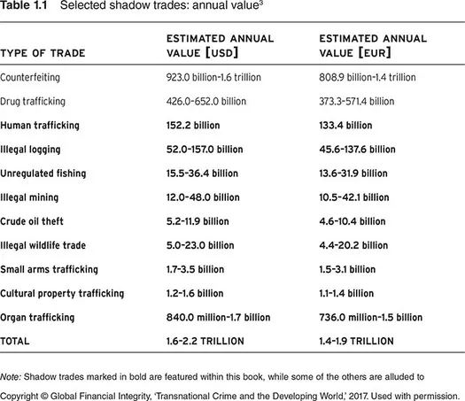 Estimates of shadow trades such as human trafficking, organ harvesting, resource plunder and small-arms sales typically have a range of value (Table 1.1). Further estimates for these and other shadow trades covered in this book such as waste disposal, tax evasion and large arms will be dealt with in their specific chapters. The largest – counterfeiting and drugs trafficking – have received considerable research attention elsewhere and so are not dealt with in depth here except for their intersects with the shadow trades covered. Money laundering, corruption and organised crime tend not to be estimated separately given their overlap with, and/or derivation from, other shadow trades.
