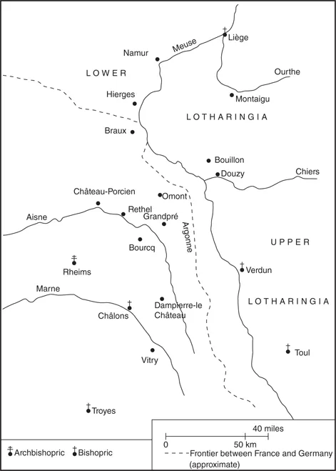 Bourcq is situated just over 26 kilometres south-east of the town of Rethel, a distance that could be covered easily in a day on horseback. It is some 50 kilometres east of the cathedral city of Rheims. To its south there is an impressive view across the rolling plains of Champagne. To the east, across the winding River Aisne, the ground gradually rises to the Argonne massif. Some 125 metres to the north-east of the church of St Nicholas (whose oldest parts date from the eleventh century) are the remains of a motte, situated on a hilly spur projecting outwards from the village centre to the north-east. The fortification is protected on three sides by slopes, and on the fourth side, which links it to the settlement, by a ditch.9