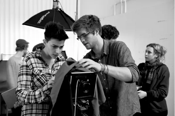 Figure 1.2 A Photographic Arts student instructs a scientist how to use a large-format plate camera in the photography studio © Chiara Ceolin