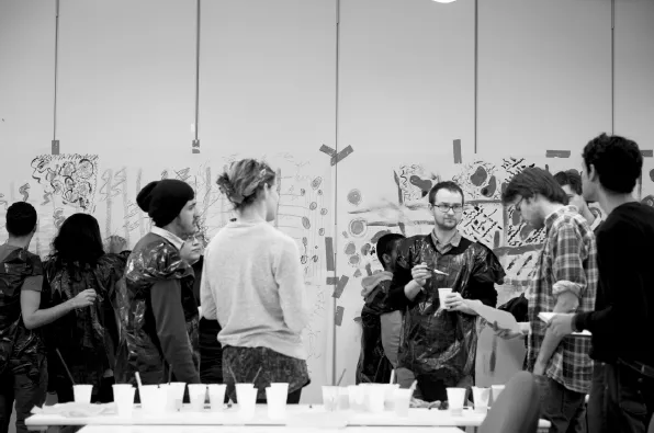 Figure 1.4 An Illustration student leading a group drawing exercise, following verbal descriptions and observing the range of interpretations © Chiara Ceolin