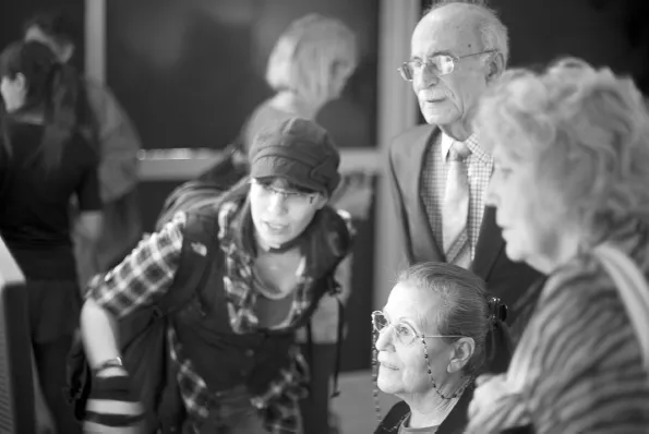 Figure 1.5 A student explaining work to visitors to a Broad Vision exhibition at London Gallery West © Chiara Ceolin