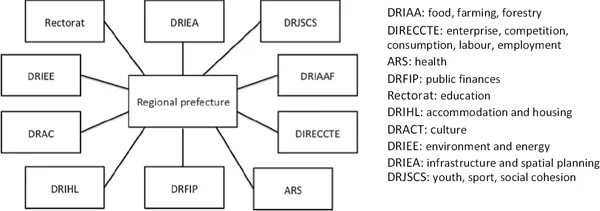 First, central government has a strong presence, much more so than in France’s other big cities, notably because its territory encompasses Paris, the national capital. The presence of central government is revealed first of all through its administration, both central administration with the ministries, but also at local level with a regional prefecture and seven prefectures of départements. The prefect of the region is also the prefect of Paris. The regional prefecture employs several thousand civil servants who are spread across some ten regional directorates, notably covering agriculture and food, infrastructure and spatial planning (see organization chart in Figure 1.1), social cohesion, culture, the economy and employment, the environment and energy, education, housing, health, etc. Some of these directorates also exist at the level of the départements. This local administration of the state is very powerful. It is in charge of implementing state policies, monitoring state monies and subsidies to local authorities. It is also significantly involved in local policies; for instance, the regional master plan is elaborated in parallel by the regional council and the regional prefecture.