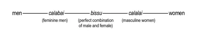 The overwhelming majority of Bugis people are men or women, but the notion of gender as a spectrum from male to female, and an emphasis on gender identity as shaping social roles (contrasted with our societyâs focus on sexual identity), makes room for calalai, calabai or bissu to find tolerance or even acclaim in their local communities. It also shapes menâs and womenâs sense of themselves as existing on a continuum, not as âoppositeâ sexes, or as different as Mars and Venus.