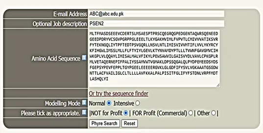 - Go to Phyre2 homepage ( http://www.sbg.bio.ic.ac.uk/phyre2/html/page.cgi?id= index). An interface will open where the amino acid sequence of the respective protein will be uploaded, e.g., PSEN2