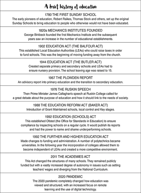 Whilst it isnāt the aim of this book to go into great depth on historical developments in education, it is useful to have an understanding of how things have evolved over the years and the impact this has had on the role of the teacher. The examples provided in this section are mostly based on the English education system but there are a number of similarities with education in other countries. In our experience of working with colleagues in Europe and North America, the process has been quite similar, even if the specific steps are different.
