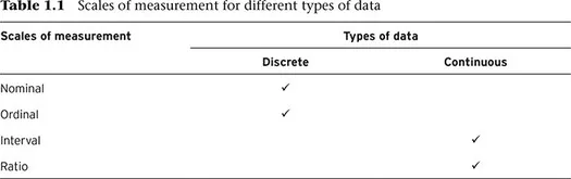 The concepts of measurement and scales of measurement are often used interchangeably by practitioners and in some news articles and textbooks. However, they do not have the same meaning. Stevens (1946, p. 677) defines measurement, in general terms, as the âassignment of numerals to objects or events according to rulesâ. There is an interlocking connection between the aspects of an object or event, the properties of numerals, and certain empirical operations performed, which will lead to certain types of scales, as shown in Table 1.1. The four scales of measurement are nominal, ordinal, interval and ratio. Also, these scales of measurement can serve as a guide to the statistical procedures that can be used with the data and the conclusions that can be drawn from them.