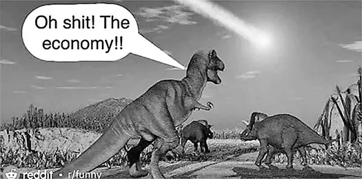 Letâs illustrate what we mean with an example. Figure 1.1 is a meme that a friend posted to my Facebook account during the COVID-19 pandemic outbreak of 2020. If we consider the meme out of context, we may find this funny due to the imagery and written words working together. It is funny that dinosaurs would know that the meteor crossing the sky will cause a major catastrophe. It is also funny that they are worried about the economy instead of their very existence. Even without the COVID-19 pandemic contextualization, this is a political statement about how many of us in society value economics over all else. However, this meme becomes not only funny but also more focused in its political critique if we know the political context. I showed this to my boy and he said it was not funny. When I gave him some context, he then âgot itâ. This encounter illustrates the importance of context.