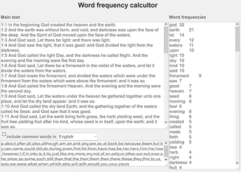 Figure 1.1 demonstrates how to extract the most frequent words in the first chapter of the Bible, using the word frequency calculator available online from Segev’s (2020) set of text analysis tools.