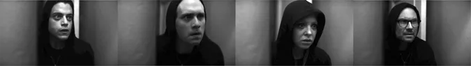 Later, she states: âSchizophrenia never had an easy access codeâ (1991: 111). For Ronnell, as for her inspiration of this idea, Deleuze and Guattari, schizophrenia is a figure of a subject who is not contained by the processes of Oedipalization and has not acceded to the regulatory framework of identity formation. Not limited by the psychoanalytic lack that drives desire in its theatre of representation, the schizophrenic evades the webs of signifiers that saturate society and works to create the real. A central preoccupation of the serial Mr Robot is the constant questioning of whether Elliot, in those moments of the greatest destruction of the system of capital, is not simply being manipulated by a different, more powerful agent seeking to emerge stronger out of the catastrophic destruction he enacts. Nevertheless, the attraction of Elliot as a character is precisely his refusal to be contained by any of these individual strategies and his constant oscillation between the contradictory poles of schizophrenia and ego. The point is that both are necessary and rather than Elliot being an exception, he articulates the generalized state of being within capitalism where we are coerced into enacting the phase of primary identification of looking in the mirror to see who we are. Because Elliot is located at the boundary limit between individual and collective, he is prone to breaking down and collapsing from Elliot into Tyrell, Angela, or Mr Robot, each connecting with the other through their eyes in an ocular network of anxiety that activates each one in an endless cycle of what Massumi describes as âbodily irritabilityâ (2005: 46). This is illustrated here as Elliot looks into the mirror and in subliminal flashes all the key personalities are recomposed in a series of hooded faces.