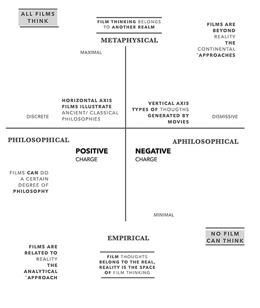 Films make us think, characters in movies philosophize, their stories are carriers of philosophical questions and problems, and cinema is even considered to be a new form of thinking. These statements appear axiomatic, as they are purported by many film philosophers, film critics, theorists, and filmmakers. An entirely new and autonomous academic field was promptly created around these presuppositions, consecrated with a generous label: âfilm-philosophy.â With innumerable publications, journals, articles, and books coming out at an astonishing rate, it would be impossible to deny that films can âdo philosophy,â or at least that they can generate various forms of philosophizing. A myriad of titles tagged âThe philosophy of âŠâ are constantly published, placed in distinctive categories on library bookshelves. Upgraded versions of the same denomination, such as âPhilosophers on filmâ or the various philosophers that forcibly took âto the movies,â become activated as soon as a new film production is in theaters. Once a movie is released, far-reaching explanations of its philosophical contents are already available, in-depth meanings of the special thinking residing within a genre are extracted, and revelations about the particular philosophies created by the moviemaker are uncovered. To the surprise of many moviegoers, who find out only in the bookstores what they were supposed to understand while watching the fascinating images quickly shimmering on the big screen, such books suggest a plethora of ideas, presumably preexisting in those films.