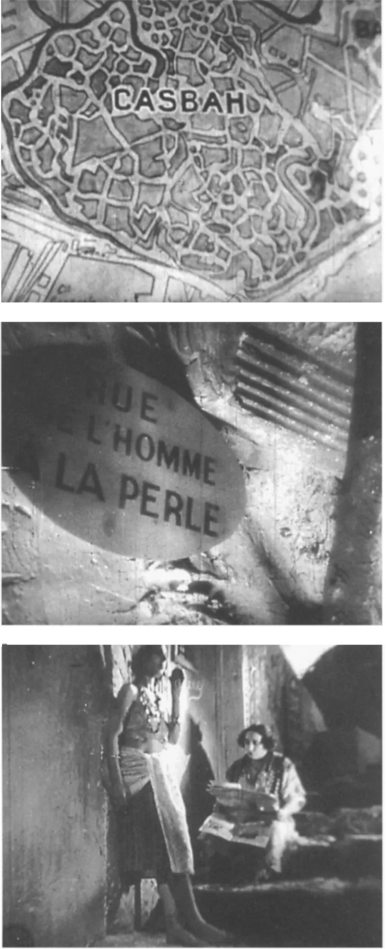 The novel opens with petty crook Carlo ('Carlos' in the film) hiding in Marseilles cheÉ PĂ©pĂ©'s mother, Ninette. Carlo escapes to Algiers and takes us into the Casbah to meet PĂ©pĂ©. The film, on the other hand, begins with a map of the Casbah and remains in Algiers until the end, moving back and forth between the Casbah and the modern town (the police headquarters and the Hotel Aletti). The camera pulls back from the map to reveal a room in the police headquarters in Algiers; the exotic location is signalled by half-lowered Venetian blinds, silhouetted palm trees outside the windows and a couple of inspectors fanning themselves with their hats. As the policemen of Algiers explain to their visiting Parisian colleagues the reasons for the continued failure to capture PĂ©pĂ©, the dialogue establishes both his status as caĂŻd (chief) and the centrality of the Casbah, his hideout. A 'documentary' montage then depicts the Casbah, before moving on to the 'fictional' Casbah. The progression from map to documentary to story reveals both the film's desire to anchor itself in the real, and its trajectory towards fantasy.