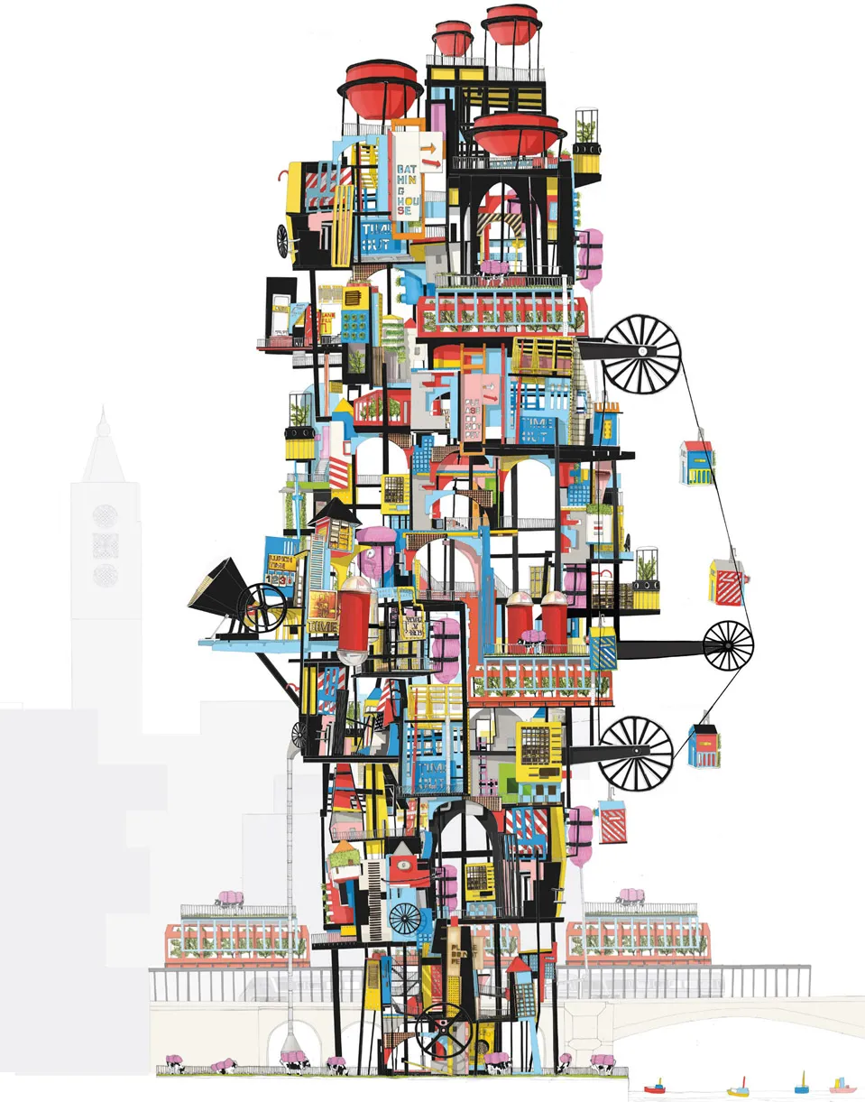 Asking how far we should take recycling and reuse, the London City Farmhouse is a riverside prototype for a self-sufficient community that integrates agriculture, housing and vertical public gardens. Noting that advocates of sustainability sometimes adopt moralistic religious metaphors in which environmental catastrophe is the punishment for human failing, space is the reward for those who contribute and a diminished lifestyle is the outcome for others who do not cooperate. Colour theory informs the choice of materials with specific hues selected for their laxative properties; all types of waste are potential energy sources.