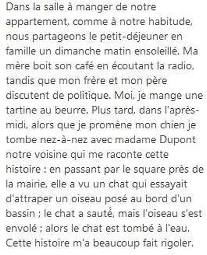 Dans ce salon oĂč ma grand-mĂšre me racontait toutes ses confidences sur sa premiĂšre nuit dâamour, nous partageĂąmes un petit-dĂ©jeuner avec ma mĂšre, mon pĂšre et ma sĆur Claire, avec laquelle nous Ă©tions si complices. Ce jour-lĂ nous Ă©tions fĂąchĂ©es Ă propos dâun garçon pour lequel nous partagions des sentiments, alors que dans ces moments matinaux privilĂ©giĂ©s, mon frĂšre, en dehors de tout, avait lâhabitude de parler politique avec mon pĂšre. Un sujet qui provoquait des Ćillades complices avec Claire, tant ces Ă©changes Ă©voquaient des travers de notre amoureux commun, qui nous exaspĂ©raient. AprĂšs avoir fini ma tartine, je me portais volontaire pour aller promener Pompon, le chien et rencontrais par hasard, Madame Dupont, la voisine, assise sur un banc Ă rire toute seule.