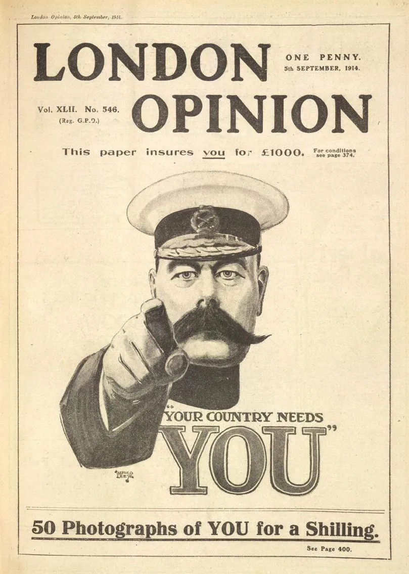 An example of the news-stand poster incorporating Leeteâs Kitchener cartoon and promoting the sale of the London Opinion issue of 5th September 1914 is now in the collections of the Library of Congress in the USA. As its advertorial function determined, the poster featured the name of the magazine prominently at the top of the poster and towards the bottom it was repeated in smaller type, as well as indicating the price of â1dâ (one penny). It combined commercial self-promotion with a patriotism that captured the mood of the war at that time.