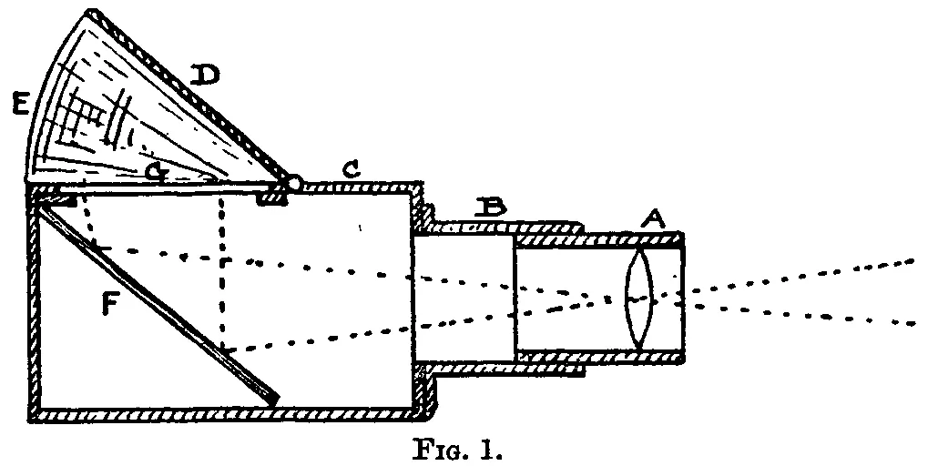 We shall first describe a small instrument, by means of which natural scenery and buildings can be focussed on to a screen and copied. A section of the complete instrument is shown at Fig. 1. The rays of light proceeding from some outside object, say a church in the near distance, pass into the camera through a lens contained in a sliding tube (A), by which it may be focussed on to a plain mirror (F), and thence reflected to a piece of ground glass (G), which is protected from the daylight by a hood or other darkening contrivance (D.) The observer sees the image by looking at (G.)