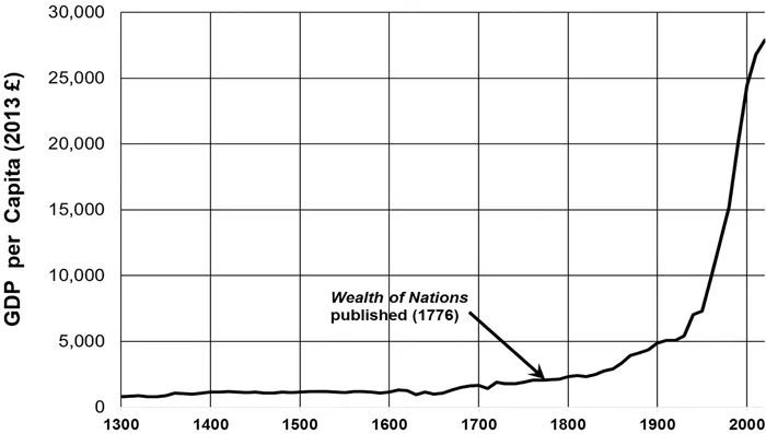 FIGURE1.1 The Rise in Real Per Capita Income, England, 1300â2020
