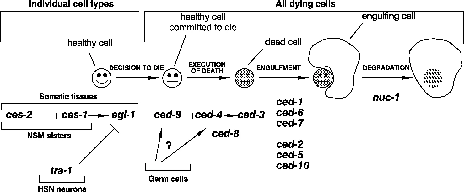- Five genes control the actual killing of the selected cells. These are ced-3, -4, -8, -9 and egl-1 (ced = cell death abnormal and egl = egg-laying defective).