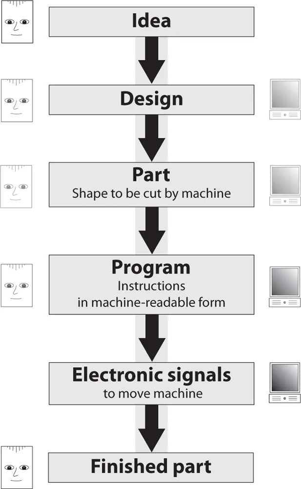 That romantic and rather unrealistic view of the process needs some refinement for a CNC machine. Fig. 1-1 shows the stages in the journey from design to completed workpiece, indicating the relative contribution of a human (on the left) and a computer (on the right). The original idea, for example, is an entirely human contribution, whereas creating the program may require both human and computer contributions.