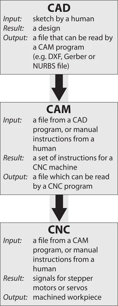 From a software point of view, there are three main stages in the process: create a design, turn the design into data and use the data to control a machine. These correspond to the conventional computer-aided design (CAD), computer-aided manufacture (CAM) and computer numerical control (CNC) stages shown in Fig. 1-2.