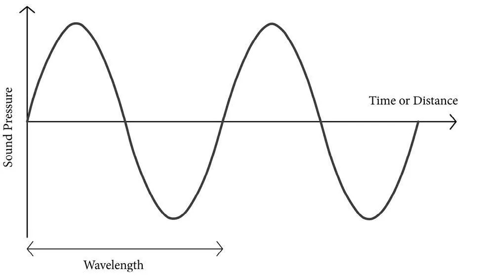 Fig. 1.2 illustrates the sound wave of a pure tone such as a steady whistle. The vertical axis represents pressure, and the waveform shows variations in air pressure relative to atmospheric pressure. These variations are very much smaller than the atmospheric pressure itself. The horizontal axis represents time or distance from the source. The first part of the wave shows a steady increase in air pressure from zero to a maximum, followed by a steady decrease back down to zero. This part of the wave is called a compression. The second part of the wave shows a decrease below atmospheric pressure down to a minimum, which then rises back to zero. This is called a rarefaction. The cycle then repeats itself. So a sound wave basically consists of a series of compressions and rarefactions.