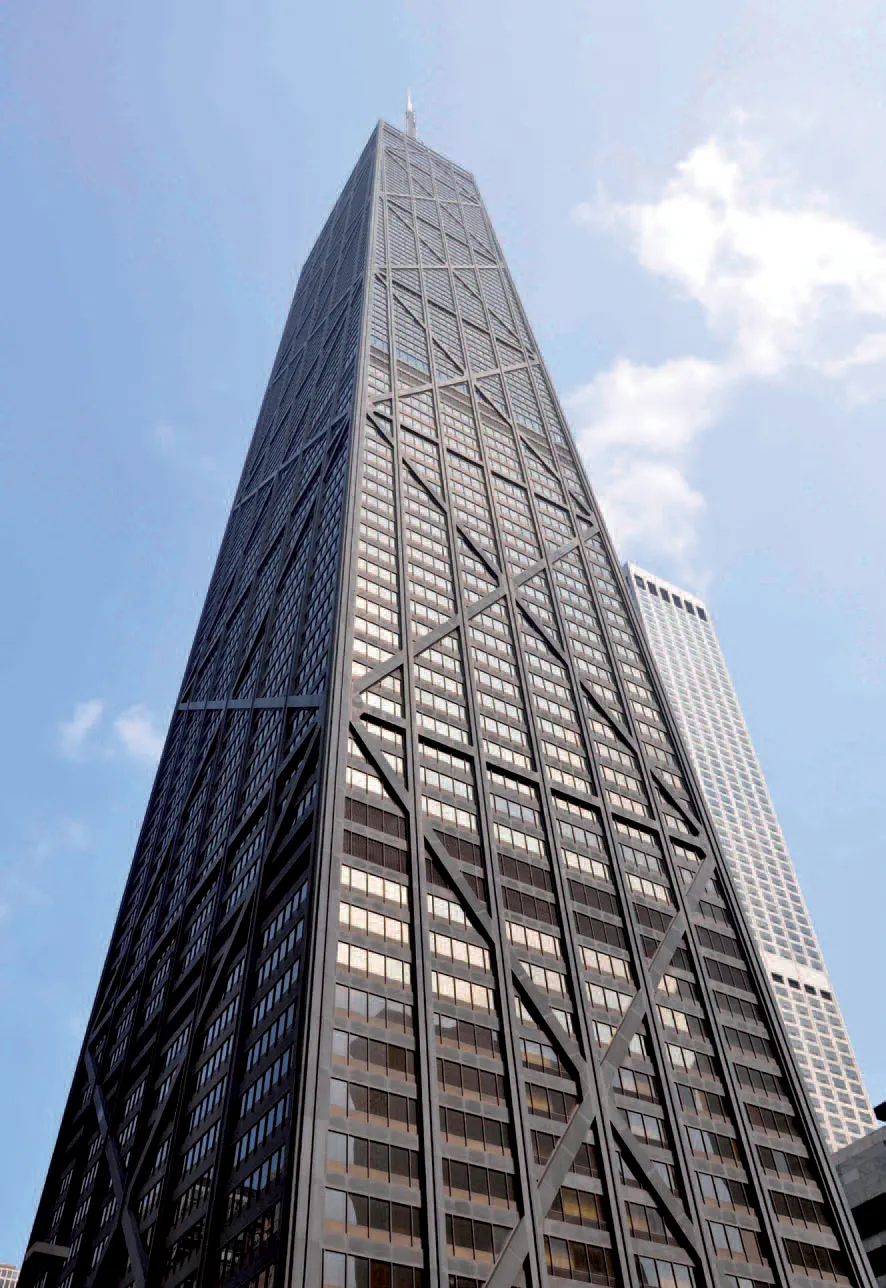 Fig. 1.7 John Hancock Building, Chicago, USA, 1969; Skidmore, Owings and Merrill, architects and structural engineers. A trussed-tube structure was adopted here to provide adequate lateral strength and forms a major component of the visual vocabulary. This is real rather than stylistic high tech. (Photo: Joe Ravi/Wikimedia Commons)
